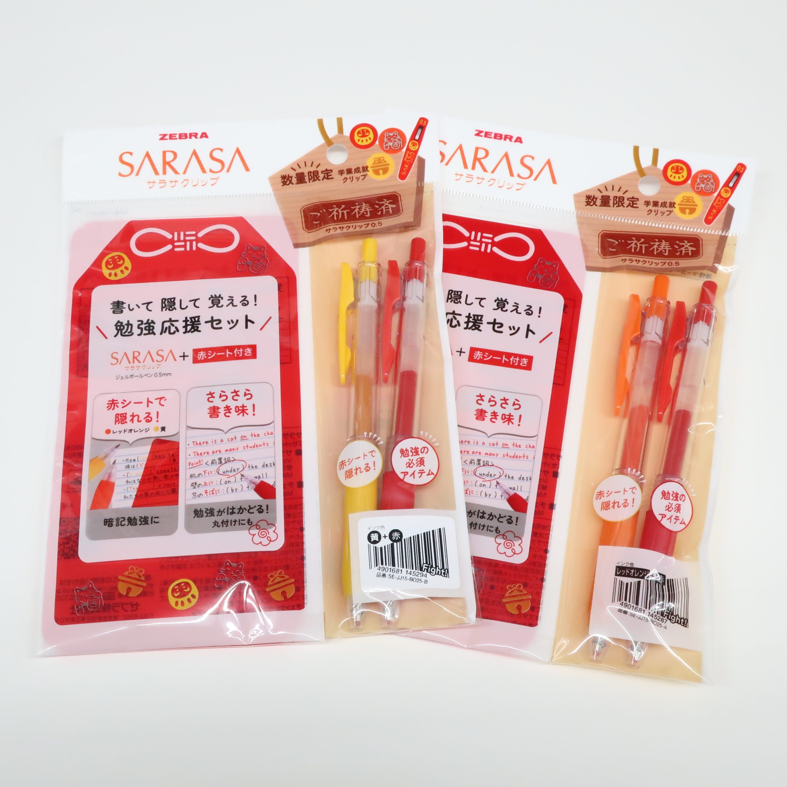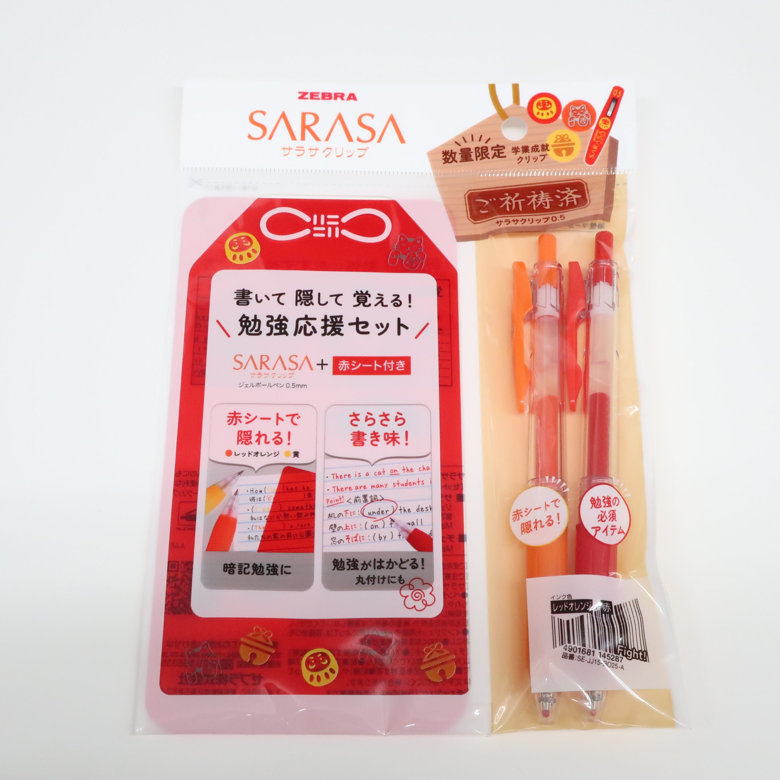【数量限定】ゼブラ サラサクリップ+赤シート付き 勉強応援セット サラサクリップ数量限定 『書いて隠して覚える勉強応援セット』 サラサクリップは学業成就のクリップデザインです。赤シートもついているので暗記勉強にも! ご祈祷済 品番/JANコード 【Bセット】 JJ15-BO25-B/4901681145294 【Aセット】 JJ15-BO25-A/4901681145287タイプ【Bセット】 サラサクリップ赤・黄+赤シート 【Aセット】 サラサクリップ赤・レッドオレンジ+赤シートボール径0.5mm内容ノック式ジェルボールペンセット/インク色 Bセット(黄 赤)Aセット(レッドオレンジ 赤) 在庫状態 : 在庫有り ¥330只今お取扱い出来ません 数量